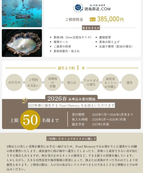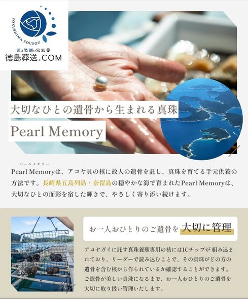 家族葬なら徳島葬送.COM ホーム 徳島葬送について 徳島葬送について 会社概要 ご葬儀プラン 家族葬 一日葬 直葬 海洋散骨 墓じまい 選ばれる理由 よくあるご質問 会員制度 葬儀の豆知識 お客様の声 各種サービス 供花・供物 お知らせ お問い合わせ 大切な方へ最後贈り物供花・供物 088-677-9070年中無休・24時間受付 無料ご相談はこちらからお問い合わせ NEWSお知らせ ホーム お知らせ お知らせ 徳島初の遺骨真珠 パールメモリー受付開始 徳島初の遺骨真珠 パールメモリー受付開始2025.11.24 徳島初・日本初のサービス、遺骨真珠パールメモリー受付開始のお知らせ! 徳島葬送.COMでは株式会社WataSelica(ワタセリカ)のご協力のもとご遺骨を真珠にして手元供養する遺骨真珠パールメモリーを徳島県で初めてサービスリリースをいたします。 真珠の中にご遺骨と識別が可能となるICチップを入れての手元供養は日本中でも初めてのサービスとなります! 11月から順次受付を開始スタートとなります。お問合せはお気軽に徳島葬送.COMへご連絡ください。 お問い合わせ 葬儀のご相談やご質問、オンライン事前相談の申し込みなどお気軽にお問い合わせください。