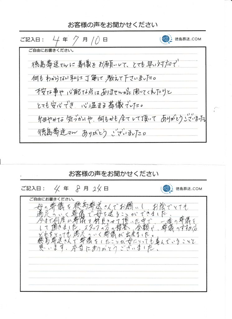家族葬なら徳島葬送.COM ホーム 徳島葬送について 徳島葬送について 会社概要 ご葬儀プラン 家族葬 一日葬 直葬 海洋散骨 墓じまい 選ばれる理由 よくあるご質問 会員制度 葬儀の豆知識 お客様の声 各種サービス 供花・供物 お知らせ お問い合わせ 大切な方へ最後贈り物供花・供物 088-677-9070年中無休・24時間受付 無料ご相談はこちらからお問い合わせ NEWSお知らせ ホーム お知らせ お客様の声 お客様の声 お客様の声2025.11.05 お問い合わせ 葬儀のご相談やご質問、オンライン事前相談の申し込みなどお気軽にお問い合わせください。